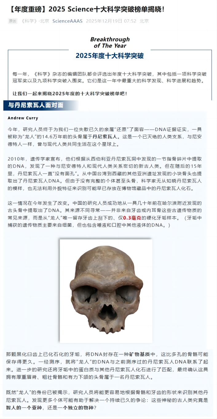 此前,河北地质大学联合中国科学院古脊椎动物与古人类研究所,通过对学校博物馆馆藏的“龙人”头骨化石及其牙结石的研究,发现“龙人”是丹尼索瓦人,且属于已知早期丹尼索瓦人支系。相关研究成果于2025年6月18日在国际顶级学术期刊《科学》(Science)与《细胞》(Cell)正刊同步发表。