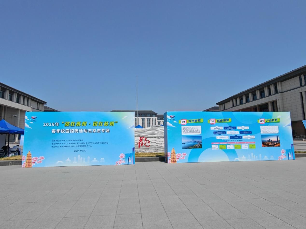 春日才遇,苏冀相约。4月18日下午,河北地质大学苏州城市人才驿站揭牌仪式暨2026“就在苏州・留在苏州”春季校招石家庄专场在我校隆重举行。苏州市人力资源和社会保障局受苏州市政府委托,在我校设立江苏省外第一个实体运作的苏州人才驿站,同时开展春季城市专场招聘活动,招聘会吸引八十余家优质用人单位携超1700个岗位需求参会,为石家庄高校学子搭建起高质量就业对接平台。