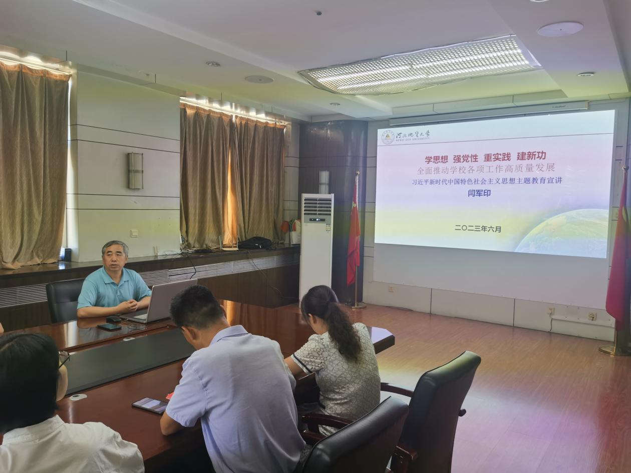 为进一步推动学习贯彻习近平新时代中国特色社会主义思想主题教育学深用实,贯彻落实全面从严治党总体要求,6月30日,我校党委常委、副校长闫军印作题为“学思想、强党性、重实践、建新功,全面推动学校各项工作高质量发展”的专题党课,发展规划处、研究生学院、地球科学学院相关负责人和部分学生党员代表参加会议。