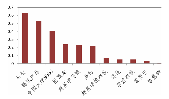 通过对现阶段教师在线教学授课形式选用的偏好性调查中,我们发现,偏好使用中国大学MOOC(爱课程)进行在线教学的教师有40.9%,偏好使用钉钉进行直播教学的有63.1%,使用雨课堂和学习通进行课堂教学的分别占24.2%和23.2%。教师对相关平台的使用情况如图2所示,为学校后续资源平台的建设提供了数据参考。