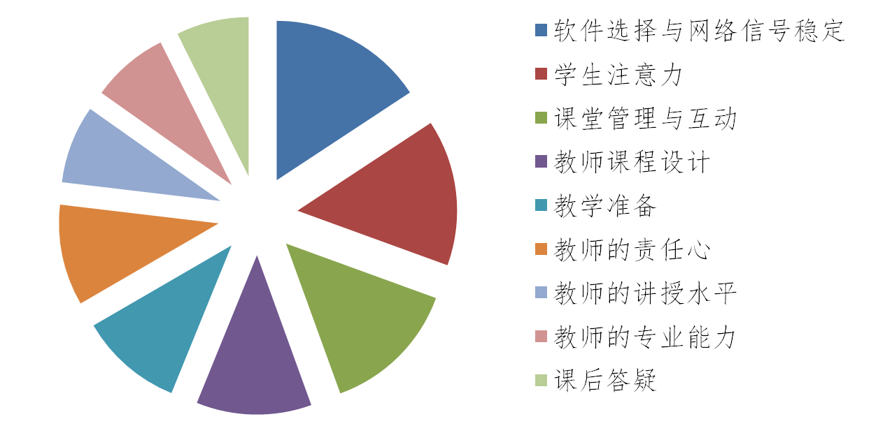 就影响线上教学效果的主要因素而言,老师们认为其重要程度依次为:教学软件选择与应用网络信号稳定、学生注意力、课堂管理与互动、教师课程设计、教学准备、教师的责任心、教师的讲授水平、教师的专业能力、课后答疑。其投票率分布图如图1所示。