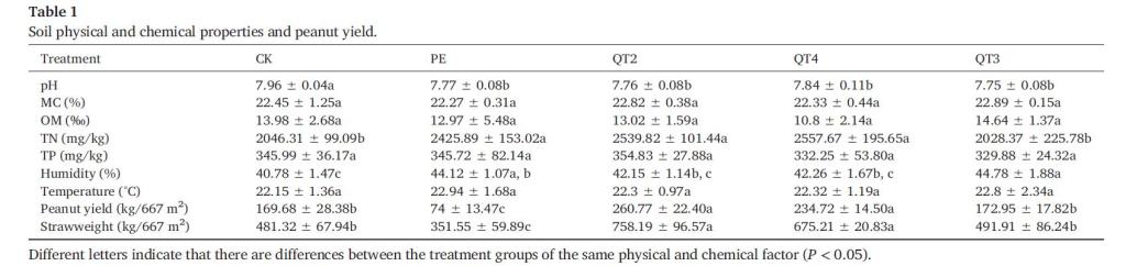 历经花生整个生长周期,对覆盖不同类型塑料地膜的农田的花生产量和种植后土壤理化性质进行了测量评估,结果如表1
