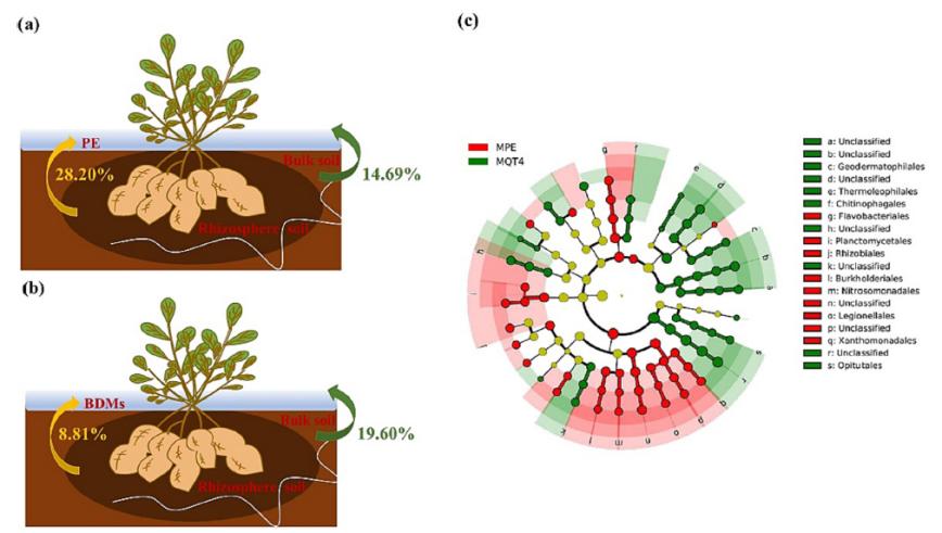 有研究表明PE膜残留物降低了土壤细菌的活性和α-多样性并对微生物网络的稳定性和复杂性产生了负面影响;而BDMs可作成为某些特定微生物的碳源,从而形成特殊类群这可能导致暴露细菌群落内的变化和特定分类群。另有研究表明BDMs残留物在土壤中的积累不影响结构组成或相关生态系统功能和过程。因此,长期或短期使用特定BDMs是否对农田生物群落和土壤植物系统产生影响亟需研究