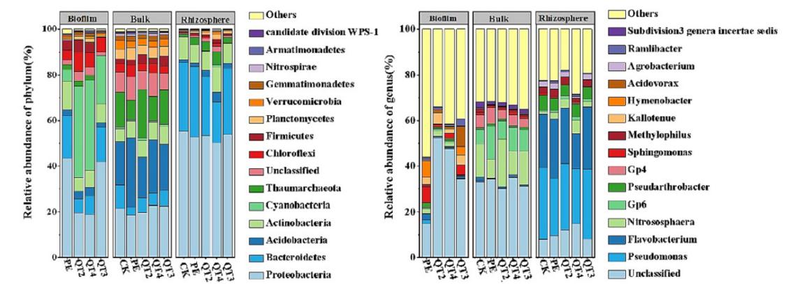 (3)农田各个区间细菌物种组成变化因塑料地膜类型的不同而不同。生物膜区间,蓝细菌门(Cyanobacteria)在BDMs上大量富集;非根际土壤区间的酸杆菌门(Acidobacteria)和绿弯菌门(Chloroflexi)在PE组丰度增加,拟杆菌门(Bacteroidetes)在BDMs中相对丰度的降低超度远远小于PE组;根际土壤区间的拟杆菌门(Bacteroidetes)只在BDMs组中显著降低,酸杆菌门(Acidobacteria)在BDMs组中丰度增加。