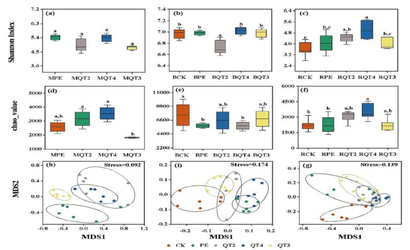 图1细菌多样性分析结果显示,所有处理(PE和BDM)Chao1指数显著减少而Shannon指数仅在BQT2显著下降。根际Shannon指数和Chao1指数BDMs组的土壤表现出显著增加,并达到较高水平。
