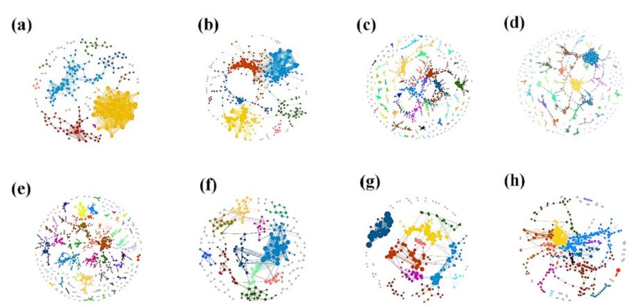 图4 细菌群落的共现网络。生物膜区间:(a)PE,(b)BDM(QT4)。非根际土壤区间:(c)CK,(d)PE,(e)BDM(QT4)。根际土壤区间:(f)CK,(g)PE,(h)BDM(QT4)。不同的颜色表示不同的模块。
