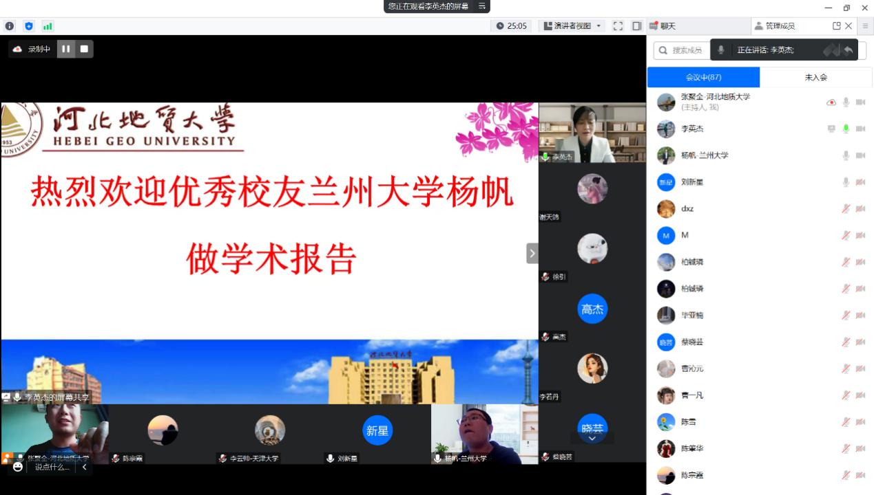 2023年4月16日,我校2013届优秀校友兰州大学杨帆副教授为我校师生作了题为“中低温热年代学在矿床剥蚀保存变化过程中的应用”的线上学术报告。报告由地球科学学院副院长李英杰教授主持,我校师生及部分对报告感兴趣的校外人士共百余人参加了学术报告会。