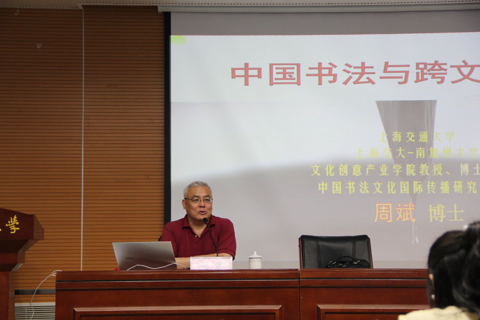 5月13日下午,由我校仰山慕水办公室主办,教育发展基金会承办的“中国书法与跨文化交流”专题讲座在北校区图书馆报告厅举办。上海交通大学博士生导师、中国书法文化国际传播研究所所长、联合国总部新闻部NGO组织“国际书法联合会”主席周斌教授担任主讲,校高等职业技术教学部副书记赵显杰、仰山慕水办公室教师代表及280余名学生聆听了讲座。