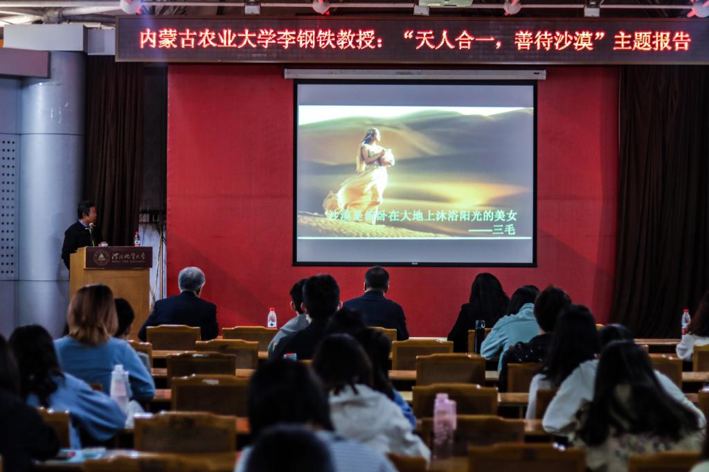 4月28日上午,国家防沙治沙标准委员会委员、内蒙古农业大学博士生导师李钢铁教授来校作学术报告。我校校友、北京明达中拓投资管理有限公司董事长孙继明、内蒙古仙那度蒙茶实业有限公司董事长霍丽华以及相关学科专业师生聆听报告会。水资源与环境学院院长于开宁主持会议。
