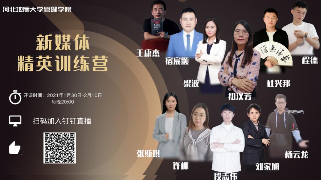 当下在大数据、云计算、人工智能等技术的推动下,新闻传播的格局正在进一步发生深刻的演变,新媒体的内容和传播呈现新的趋势。为了丰富大学生的假期生活,了解新媒体的基础理论知识,提升新媒体运营的技能,把握新媒体未来发展趋势,管理学院特邀我校新媒体领域五位校友和五位在校生作为主讲嘉宾,以“给你一个平台,让自己创造未来”为主题,开启了为期12天的培训。本次训练营通过钉钉直播的形式,从1月30日到2月10日每天20:00开播,吸引了包括管理学院、艺术设计学院、语言文化学院、法政学院以及其他社会人士在内的300多人参加。