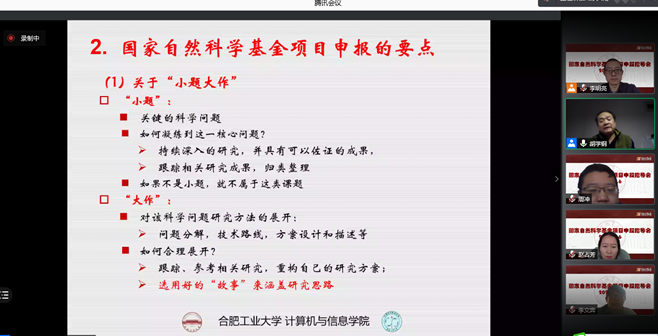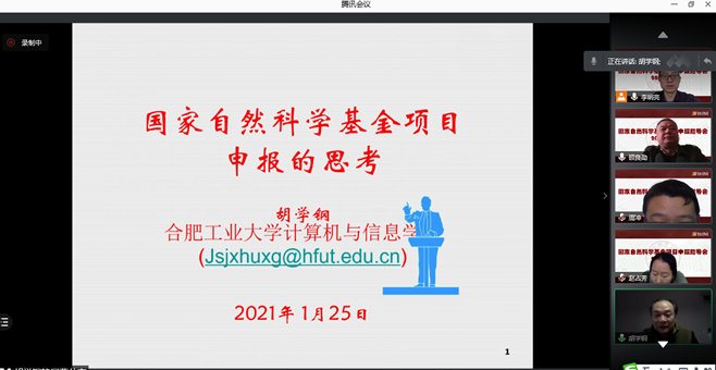 2月6日上午,合肥工业大学计算机与信息学院(人工智能学院)教授,博士生导师胡学钢应邀为我校师生进行国家自然科学基金项目申报指导。研讨会由河北地质大学信息工程学院主办,河北地质大学教育发展基金会承办,硕良勋院长主持,以腾讯会议方式进行。