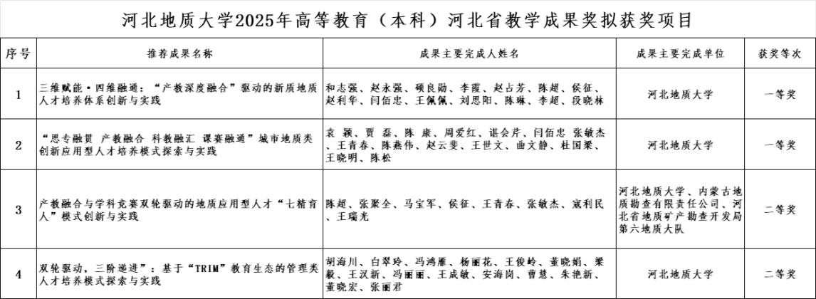 近日,省教育厅向我单位反馈了2025年高等教育(本科)河北省教学成果奖拟获奖项目。我单位共入选4项,其中特等奖0项、一等奖2项、二等奖2项。