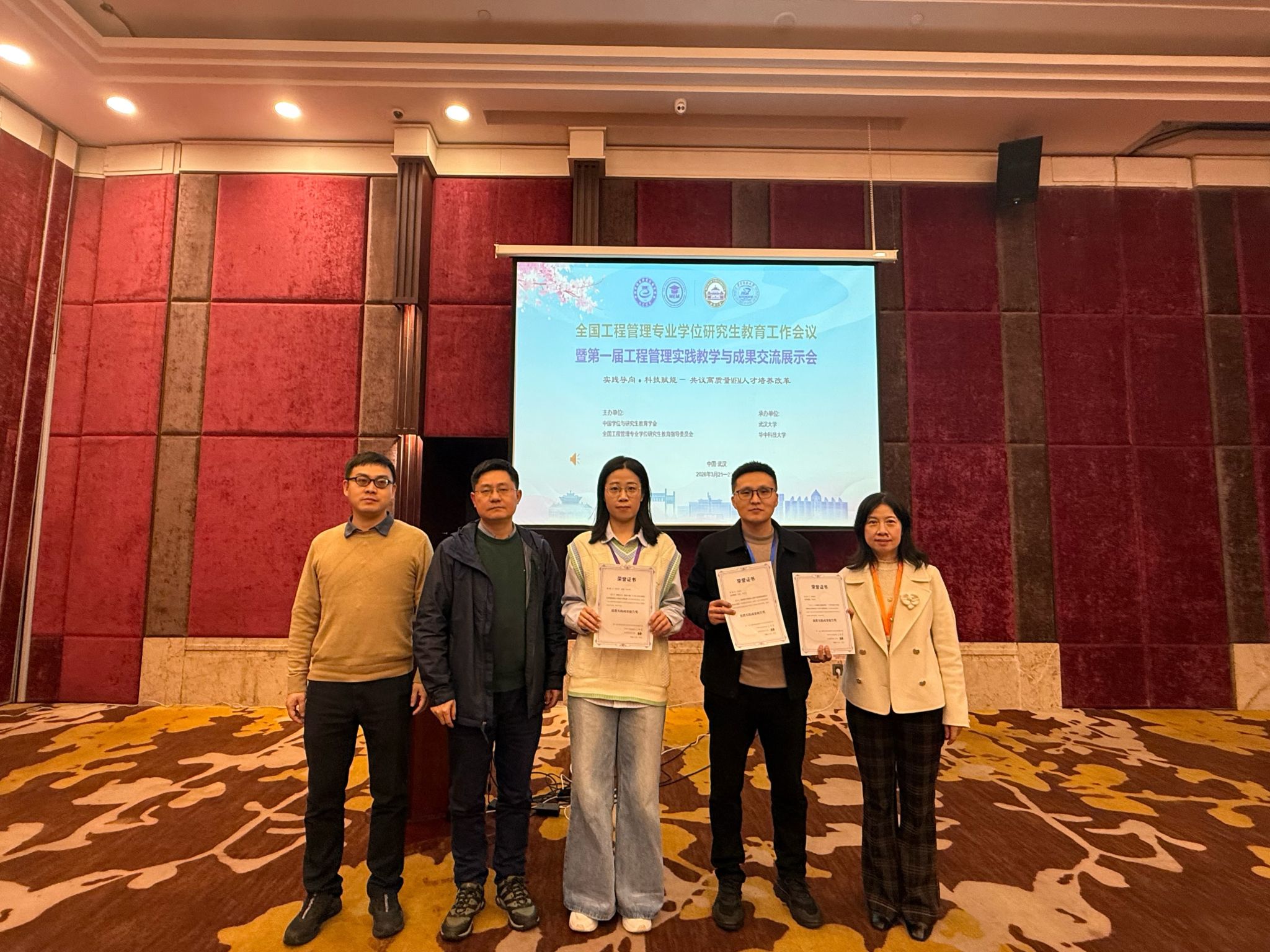 为深入贯彻教育部关于专业学位研究生教育高质量发展的部署,推动工程管理专业学位(MEM)教育提质增效,2026年3月21日至23日,2026年全国工程管理专业学位研究生教育工作会议暨第一届工程管理实践教学与成果交流展示会在武汉召开。本次会议由全国工程管理专业学位研究生教育指导委员会、中国学位与研究生教育学会工程管理专业学位工作委员会主办,武汉大学、华中科技大学承办。河北地质大学研究生学院学位办贾子纯老师、城市地质与工程学院工程管理系主任耿东阳、院长助理霍晓燕、MEM学位点教师梁秀峰及参赛学生参会,围绕MEM项目优化、实践育人、产教融合等核心议题开展学习交流。