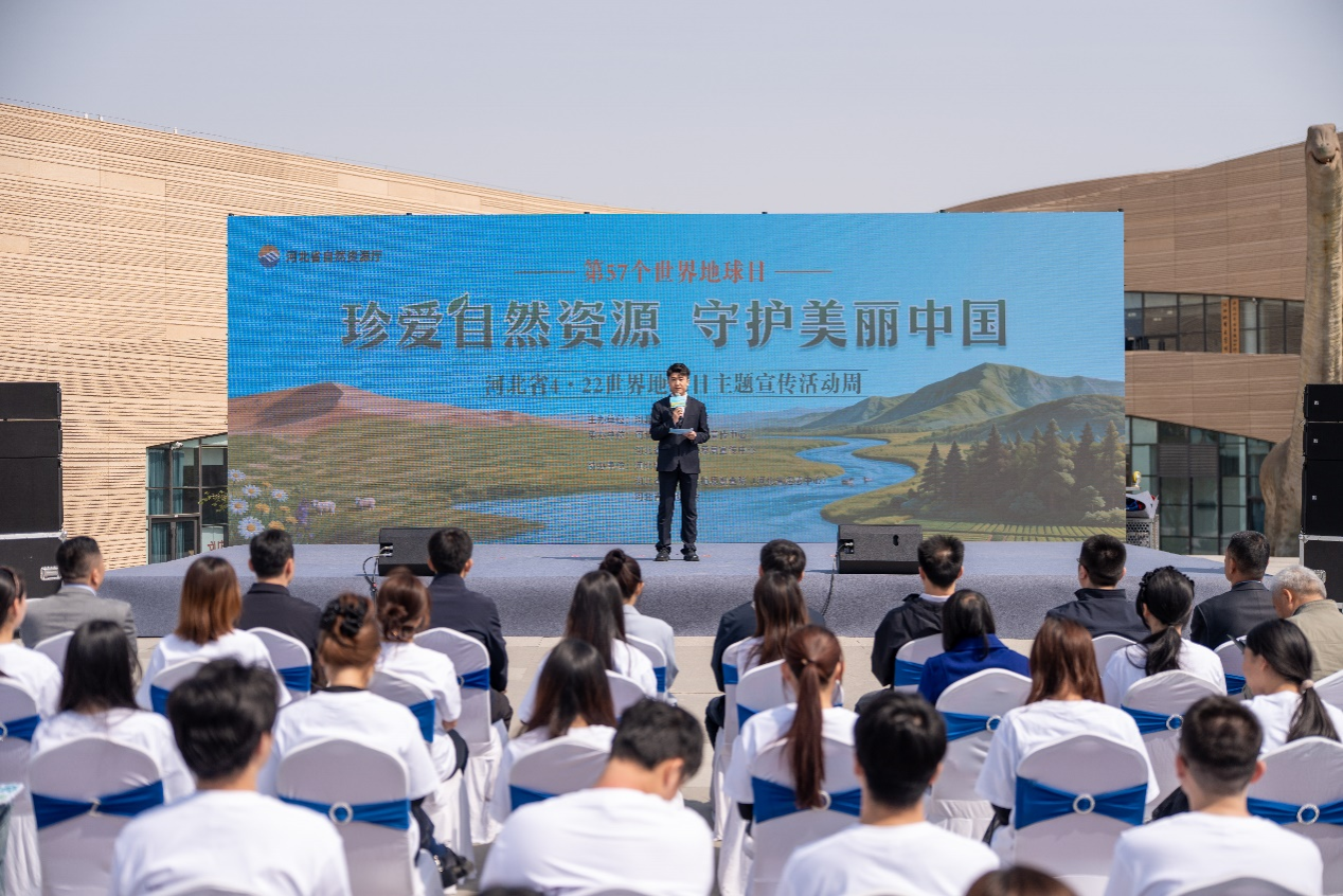我校博物馆副馆长刘傲然在活动现场介绍了博物馆及地学科普活动有关内容,展示了我校在向公众普及地球科学知识,传播生态文明理念方面的社会功能及影响力。科技处副处长刘昭和与会领导共同启动了河北省第57个世界地球日主题宣传活动周。学生科协代表经王文浩同学现场宣读了保护地球倡议书,号召全社会共同参与自然资源保护。