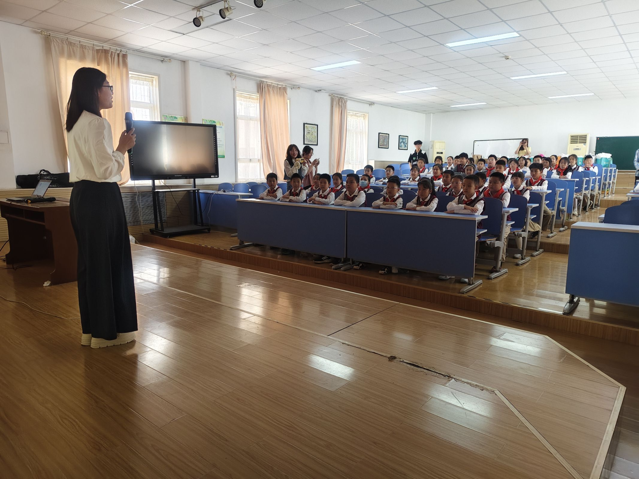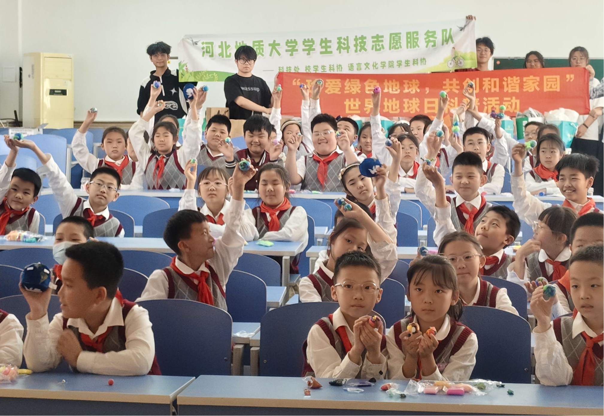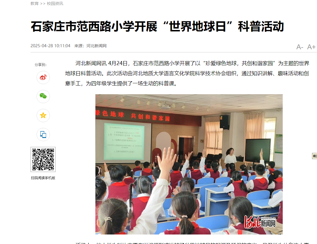 4月24日下午,学校语言文化学院科学技术协会成员走进石家庄市范西路小学,为四年级同学们带来一堂别开生面的世界地球日主题科普课。活动以"珍爱绿色地球,共创和谐家园"为主题,通过知识讲解、趣味互动和创意手工,带领孩子们探索地球奥秘,传递环保理念。
