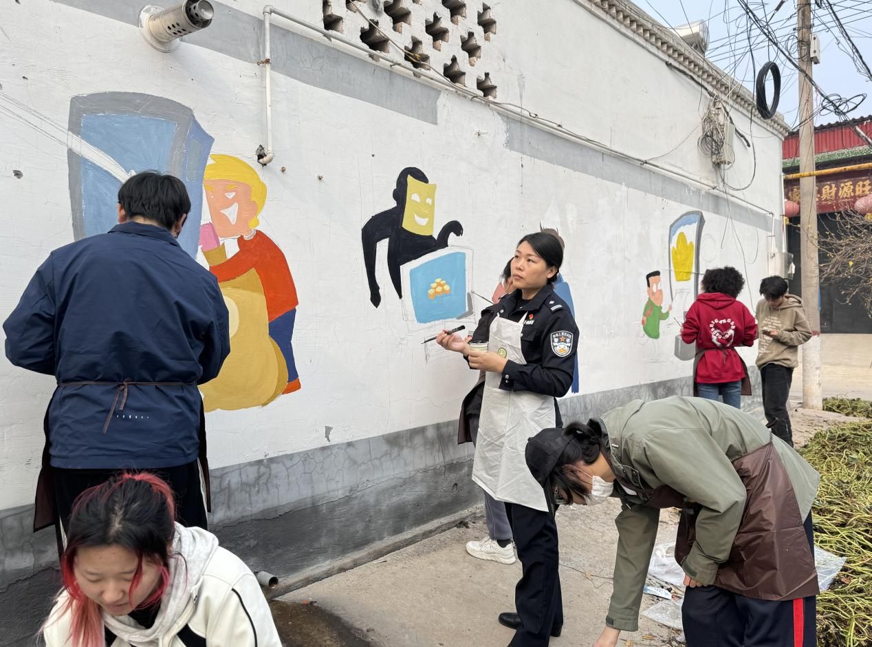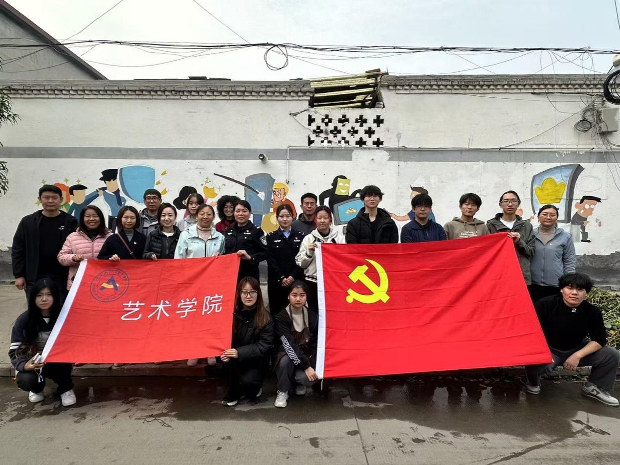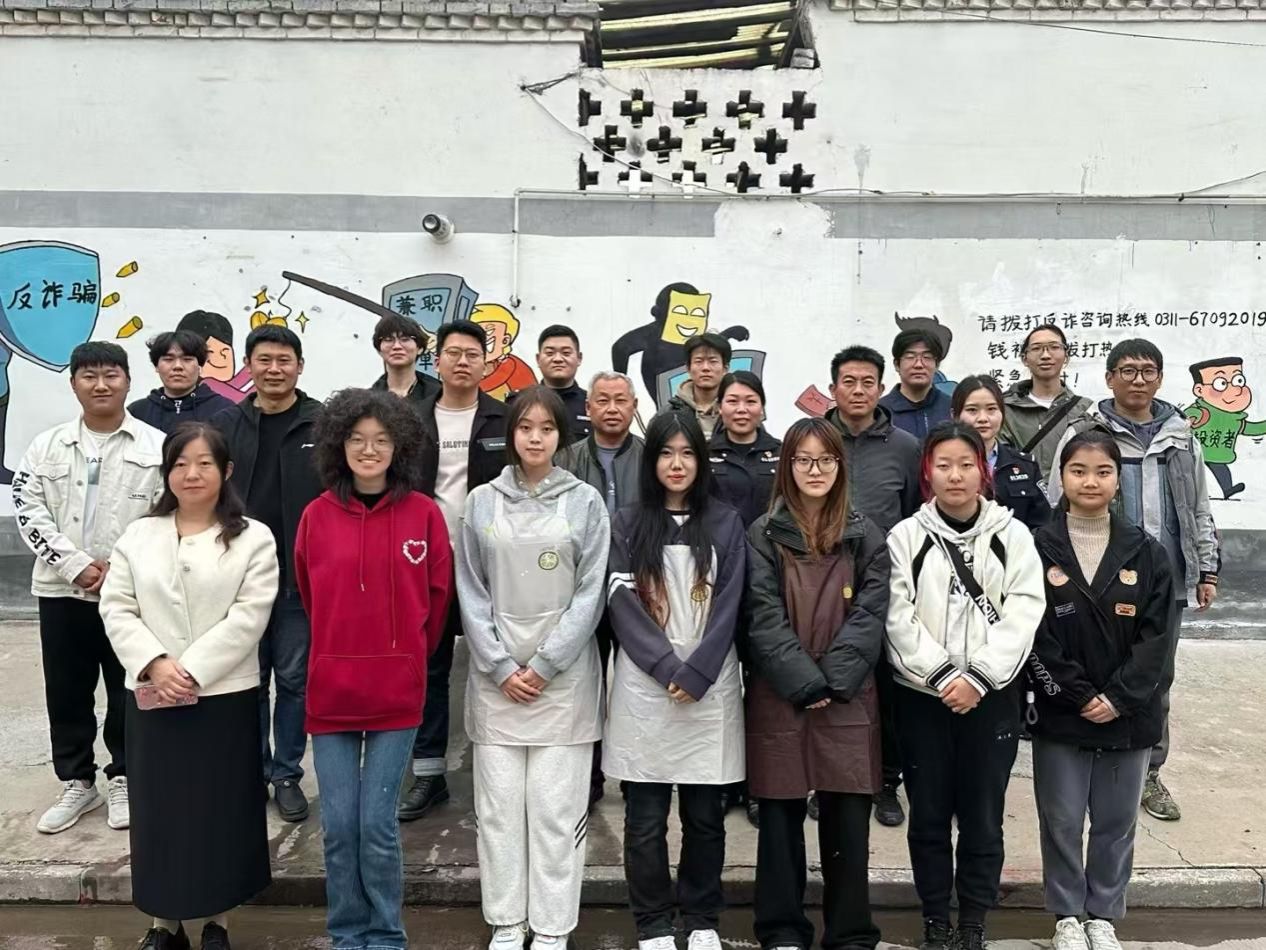 11月9日,河北地质大学新校区所在地藁城区九门乡迎来了一群特别的访客——河北地质大学艺术学院的师生。在学院党委委员、副院长郑新涛老师的带领下,由产品设计教研室周晨晓老师担任指导教师的党团实践小分队,他们手持画笔,心怀理想,保持着对艺术的无限热爱和对社会的深切责任,与九门乡派出所携手,共同举办了一场“反电信诈骗”的主题墙绘活动。