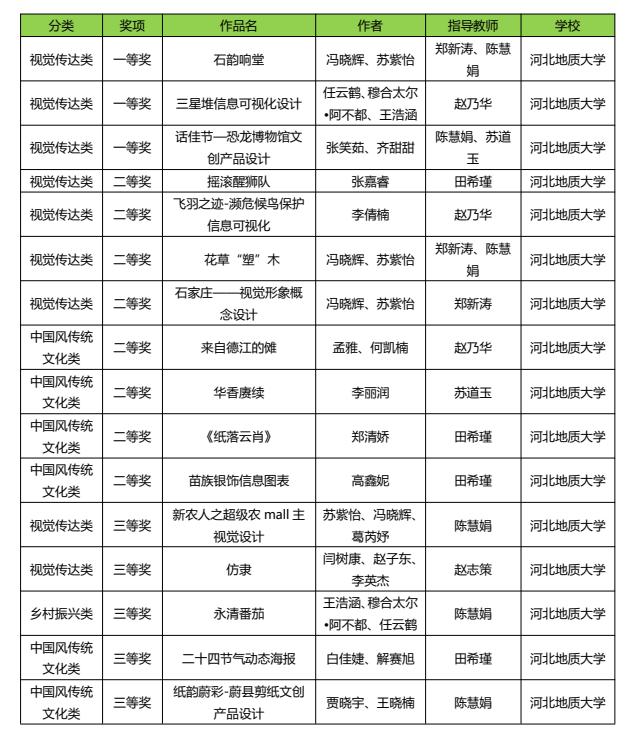 暑假期间,艺术学院不断收到获奖喜讯,具统计共获“全国普通高校学科竞赛排行榜内竞赛项目”第八届米兰设计周——中国高校设计学科师生优秀作品展和第18届中国好创意暨全国数字艺术设计大赛奖项43项,其中获国赛一等奖4项,国赛二等奖15项,国赛三等奖24项,河北地质大学艺术学院获得多个“优秀组织奖”。