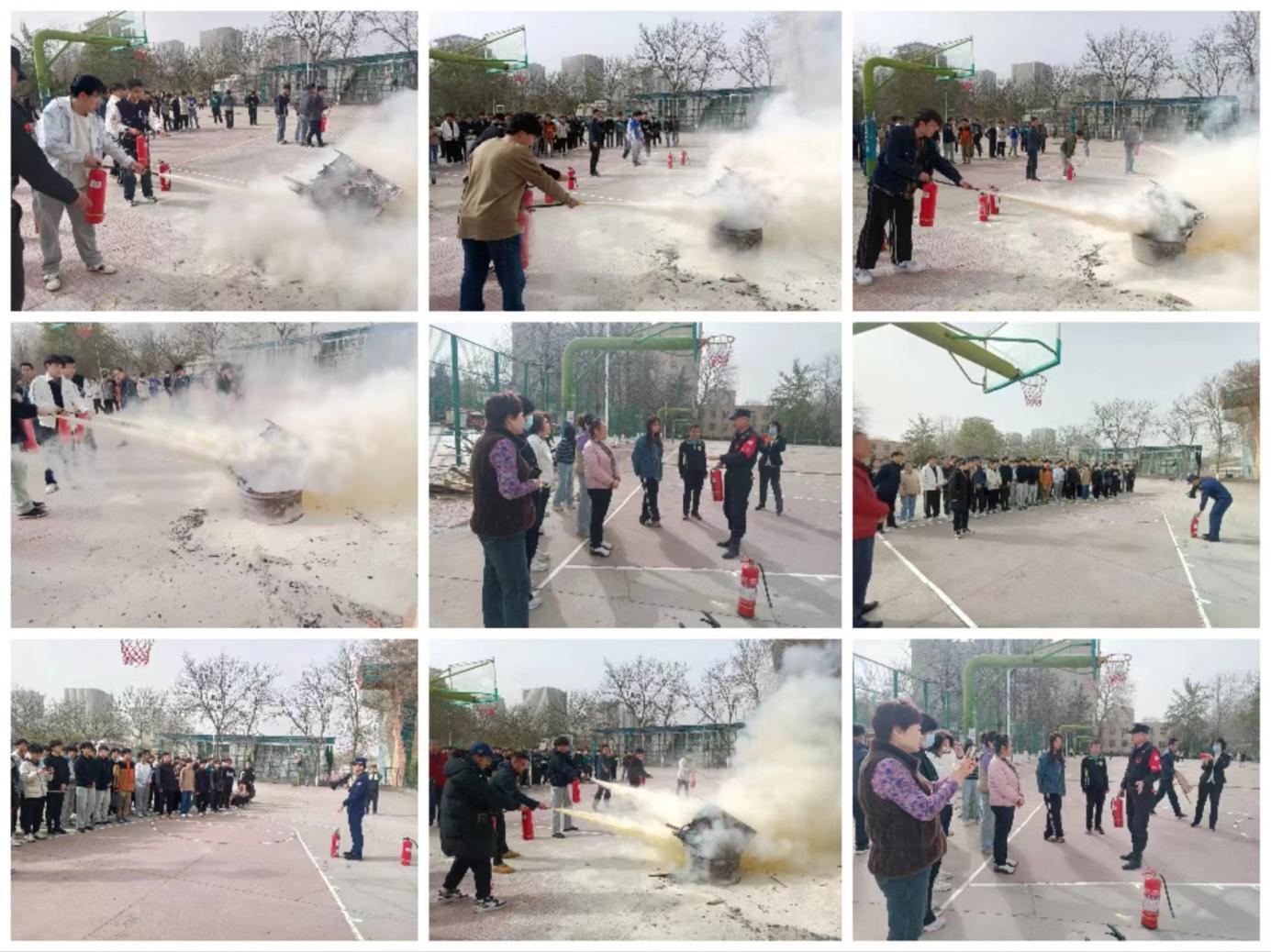 在灭火演练现场,裕华区富强消防应急中队的队员为师生们讲解演示了灭火器的使用,师生们纷纷上前进行了学操作,学习体验了实地灭火的操作。