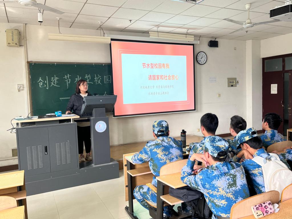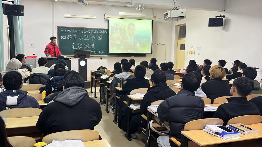 2023年10月21日,在北校区和水资源与环境学院领导的指导和支持下,我院2023级新生辅导员付志静基于学院的专业背景和特点,在河北地质大学(北校区)组织我院全体新生以班级为单位,深入开展“节水型校园有我 请国家和社会放心”主题班会,班会上付老师通过一系列真实数据,让同学们了解我国淡水资源的紧缺程度,同时使同学们深刻认识到建设节水型校园的紧迫性、必要性和重要意义;同学们通过讨论和自主发言的形式,思考和列举了日常生活中浪费水资源的行为习惯,总结发言后大家形成共识,进行了立志节约用水的宣誓和现场签字。