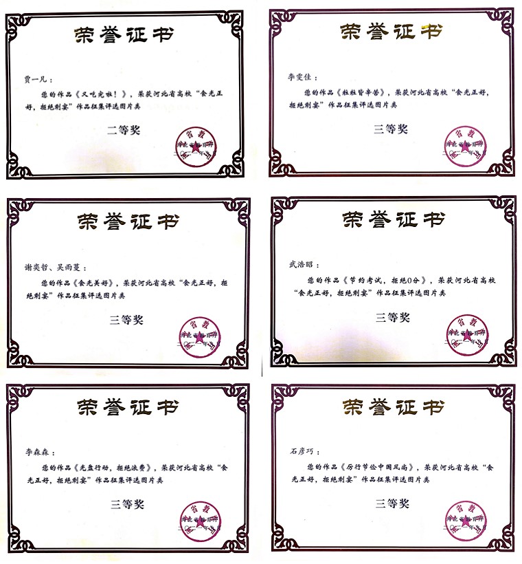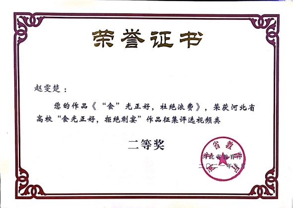 近日,河北省教育厅下发了《关于公布全省高校“食光正好,拒绝剩宴”作品征集评选结果的通知》,我校共有7项参赛作品获奖,其中二等奖2项,三等奖5项。