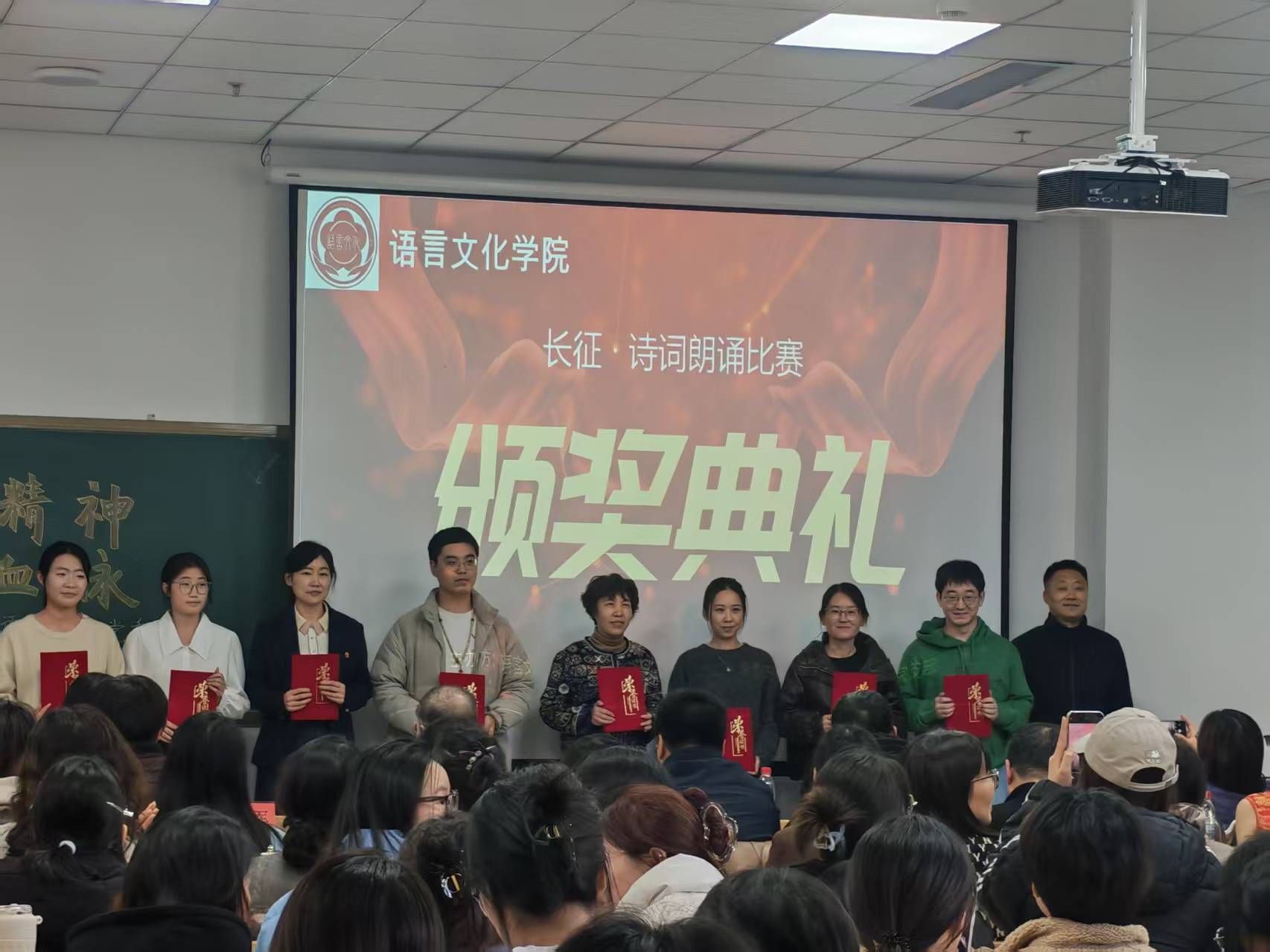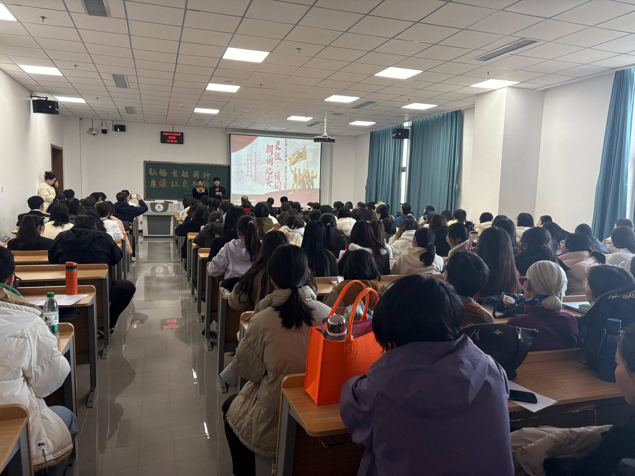 11月20日下午,由语言文化学院党委主办,教工第一党支部、分团委联合承办,聚焦关心下一代思想引领工作的“弘扬长征精神 赓续红色血脉”——“中华魂”主题诗词朗诵比赛在图书馆510成功举办。活动以主题党日、团日活动深度融合为抓手,18组师生选手同台竞技,在铿锵诵读中传承红色基因,在党团同心中凝聚奋进力量,既发挥了党组织的引领作用和党员教师的先锋模范作用,又精准对接青年成长需求,打造了一堂沉浸式“大思政课”。
