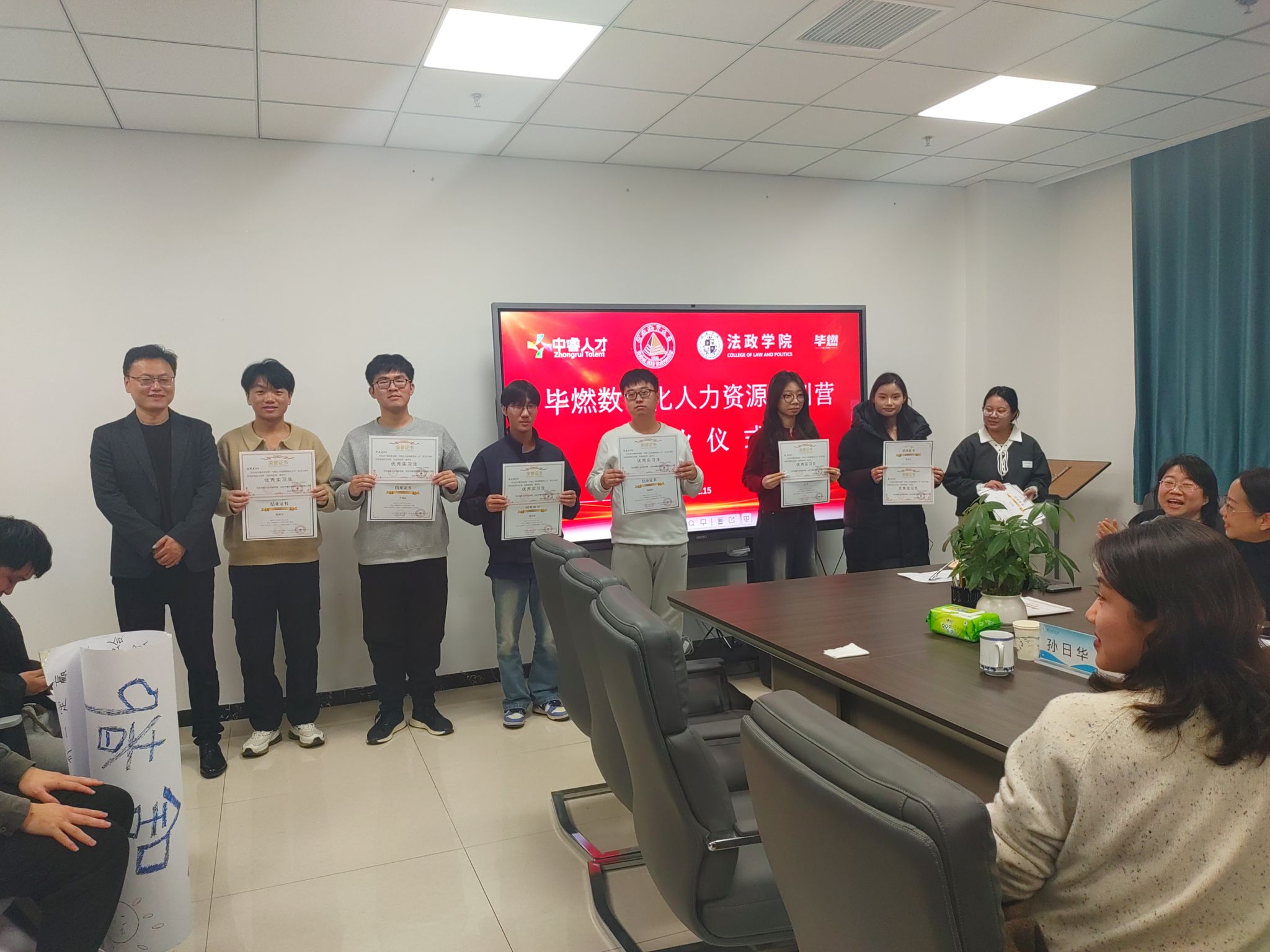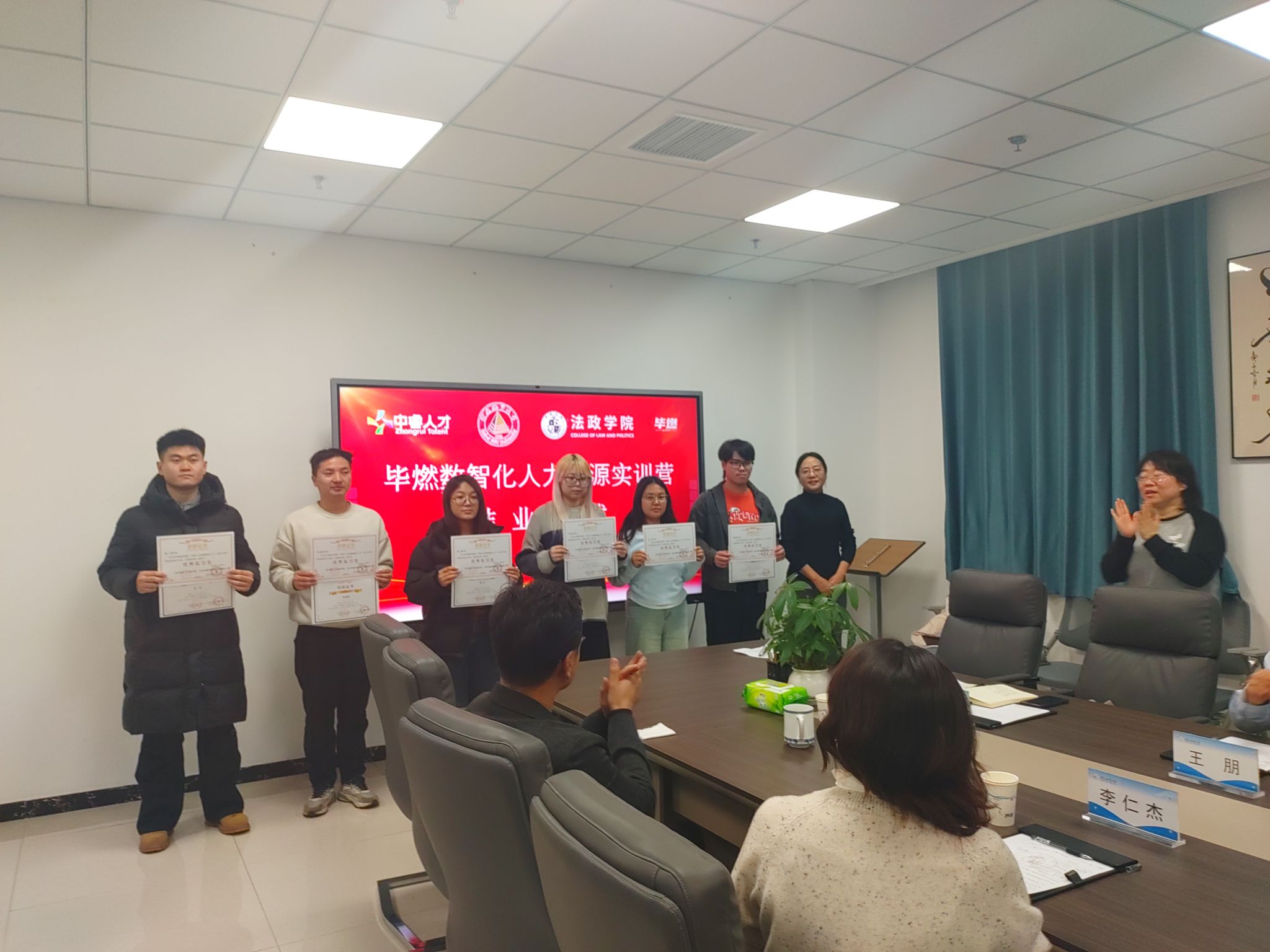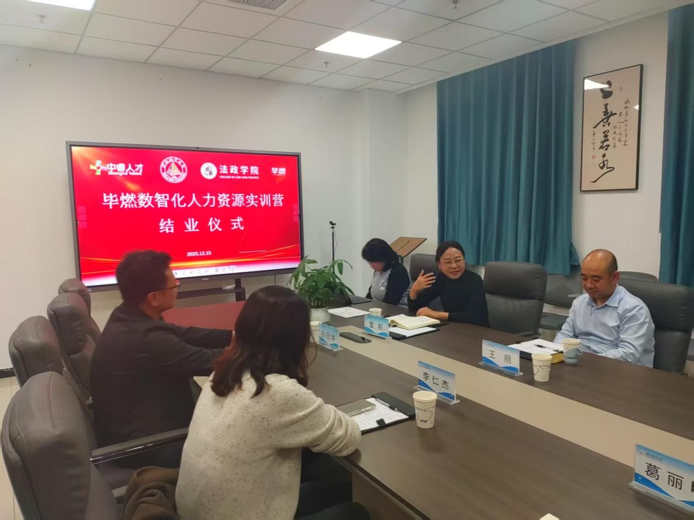 为深入贯彻落实党中央、国务院关于促进高校毕业生就业创业的决策部署,创新就业育人形式,发挥“双带头人”党建示范引领作用,12月15日至19日,法政学院联合北京中睿在职言职科技有限公司,面向2026届公共管理类毕业生举办为期五天的“毕燃数智化人力资源实训营”。12月19日下午,实训结业仪式顺利举行。校就业指导中心副主任刘晓萌、法政学院党委书记董莉、院长孙日华、教工二支部书记王璐、支部委员赵艳华及27名参训学生出席结业仪式。仪式由项目负责人王璐主持。