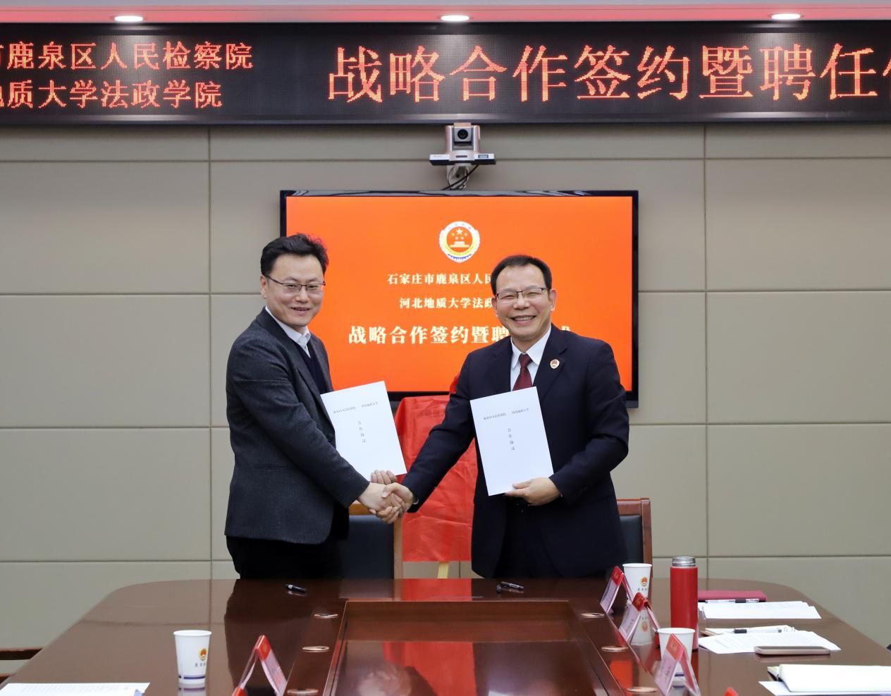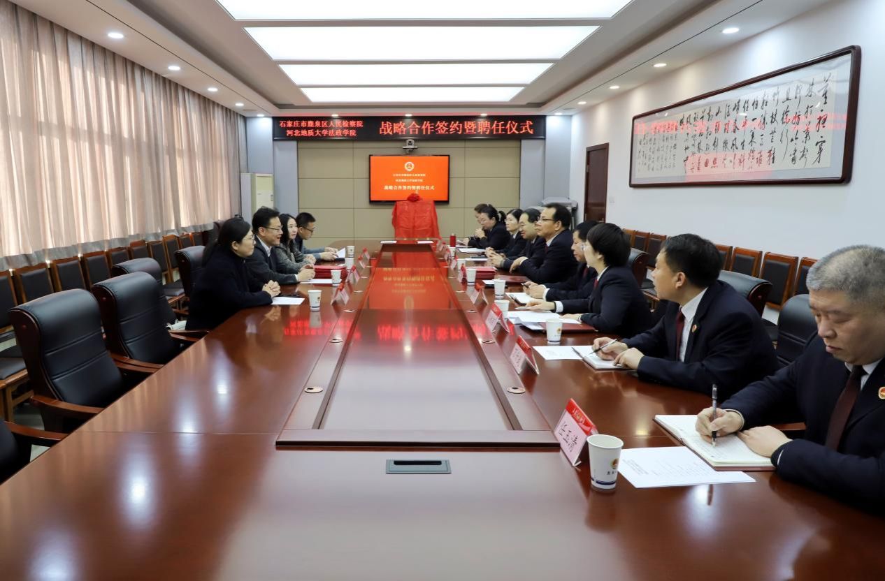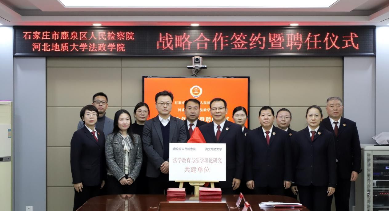 为深化法学教育改革,推动法学理论与司法实践深度融合,强化高素质法治人才培养,1月8日,河北地质大学法政学院与鹿泉区人民检察院战略合作签约暨聘任仪式在鹿泉区检察院隆重举行。河北地质大学法政学院院长孙日华、副院长王丽慧、法学系主任葛丽明、学院实践教学中心主任韩建祥,鹿泉区检察院党组书记、检察长王玉录及该院全体班子成员、中层干部出席活动。