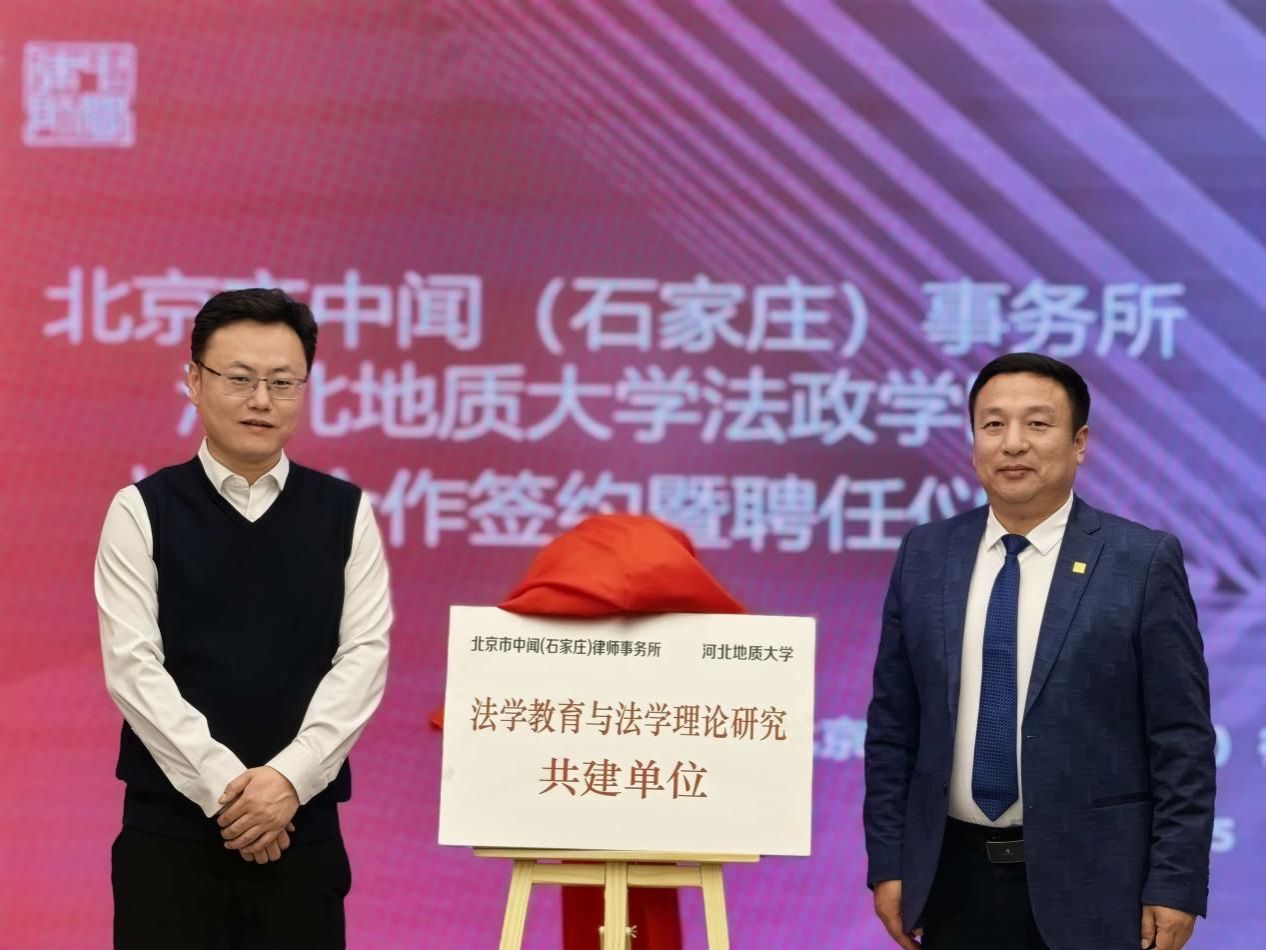 在全体与会人员的共同见证下,中闻石家庄办公室执行副主任赵恒友与孙日华共同为“法学教育与法学理论研究共建单位”揭牌,中闻石家庄办公室管委会委员王立强与孙日华签署了正式合作协议。王丽慧为中闻石家庄办公室名誉主任张建勇、吕振宗等八位律师颁发河北地质大学客座教授聘书。
