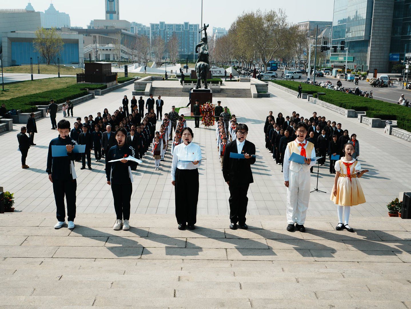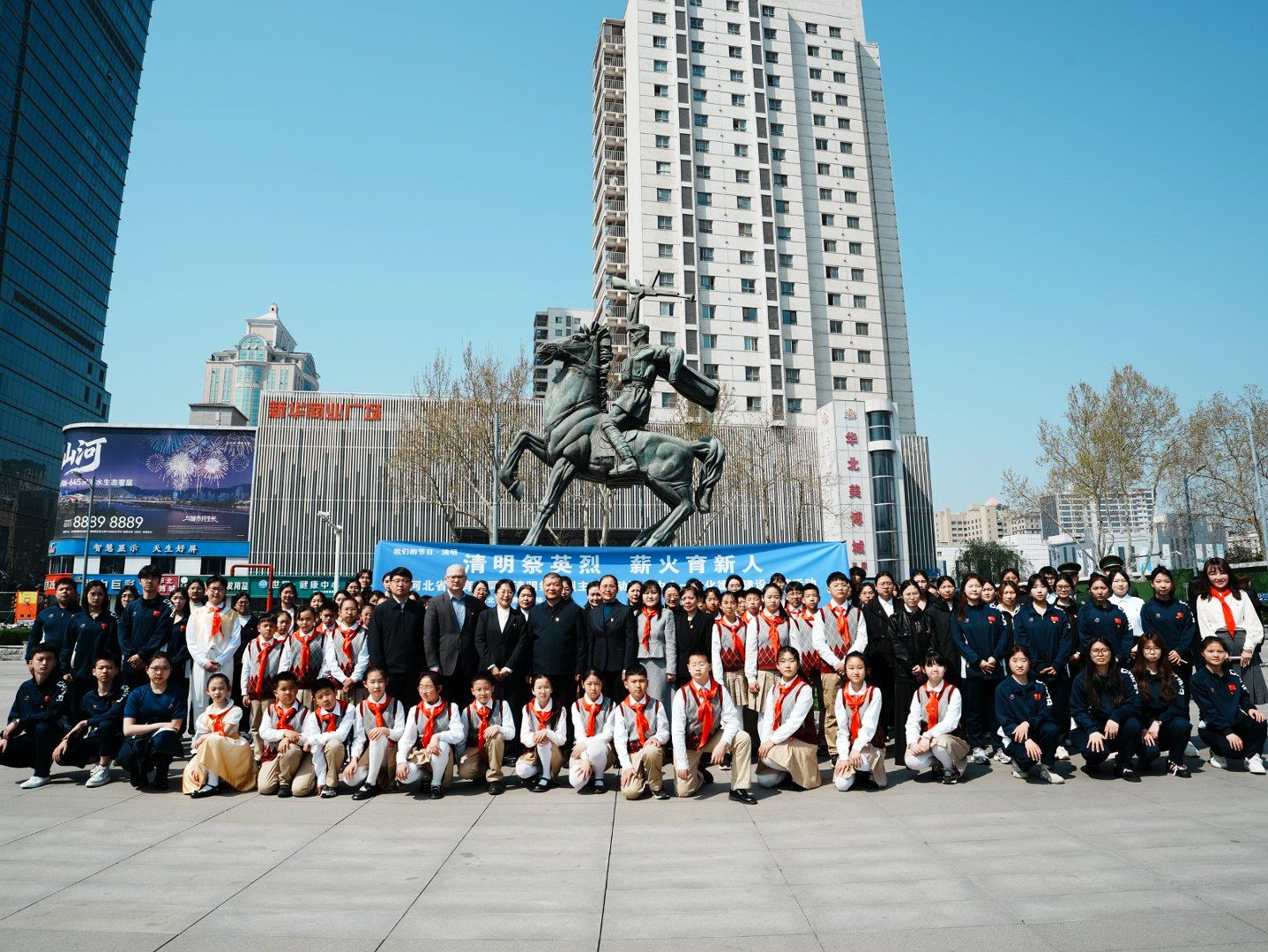 上午10时许,全体人员有序转场至石家庄解放纪念碑前,核心祭扫仪式正式启动。伴随庄严国歌,全场肃立致敬;一分钟默哀环节,哀思深沉、敬意绵长,全体师生向为民族独立、人民解放、国家富强英勇献身的革命先烈致以深切缅怀。“大手拉小手” 联合献词环节,学院学生代表与中小学生代表以青春之声诉说敬仰、以铿锵誓言承诺传承,字字句句饱含家国情怀。