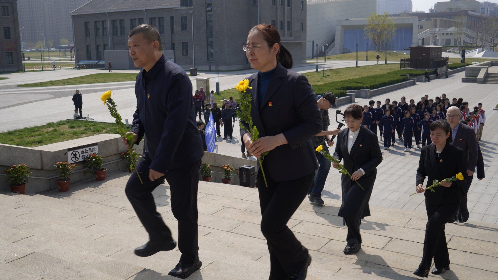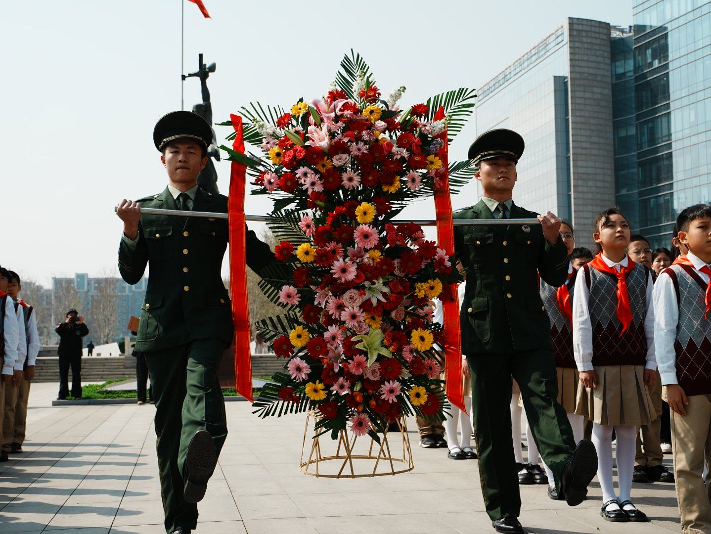 献词结束后,河北地质大学国旗护卫队的2名礼兵,正步护送花篮至纪念碑下。在寄托哀思和崇敬的《献花曲》中,河北省学校德育工作中心主任蔡杭州、河北地质大学语言文化学院党委书记宋朝霞缓步上前,整理花篮缎带。