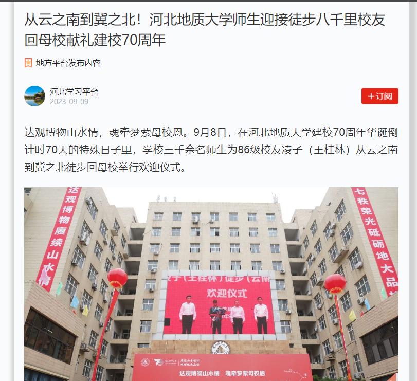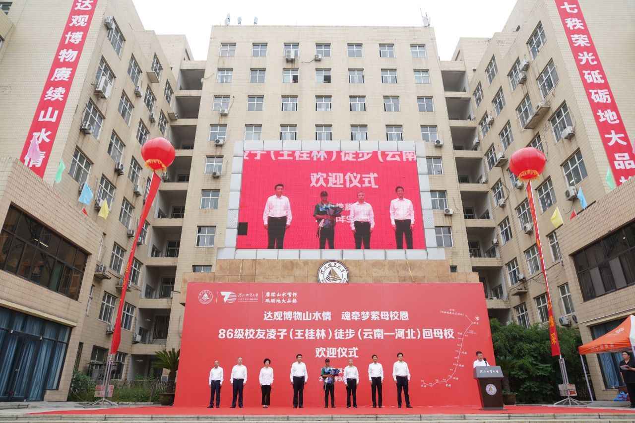 达观博物山水情,魂牵梦萦母校恩。9月8日,在河北地质大学建校70周年华诞倒计时70天的特殊日子里,学校三千余名师生为86级校友凌子(王桂林)从云之南到冀之北徒步回母校举行欢迎仪式。