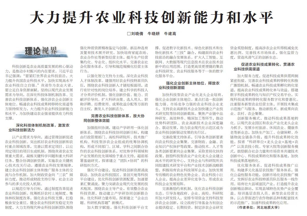 科技创新是农业高质量发展的核心驱动力,是推动乡村振兴的内在要求。习近平总书记强调:“要紧盯世界农业科技前沿,大力提升我国农业科技水平,加快实现高水平农业科技自立自强。”我省作为农业大省,要立足自身资源禀赋,坚持以现代农业发展需求为导向,在深化科技体制机制改革、完善农业科技创新体系、强化涉农企业创新主体地位、畅通农业科技成果转移转化渠道等方面持续发力,大力提升农业科技创新能力和水平,为加快建设农业强省提供有力科技支撑。