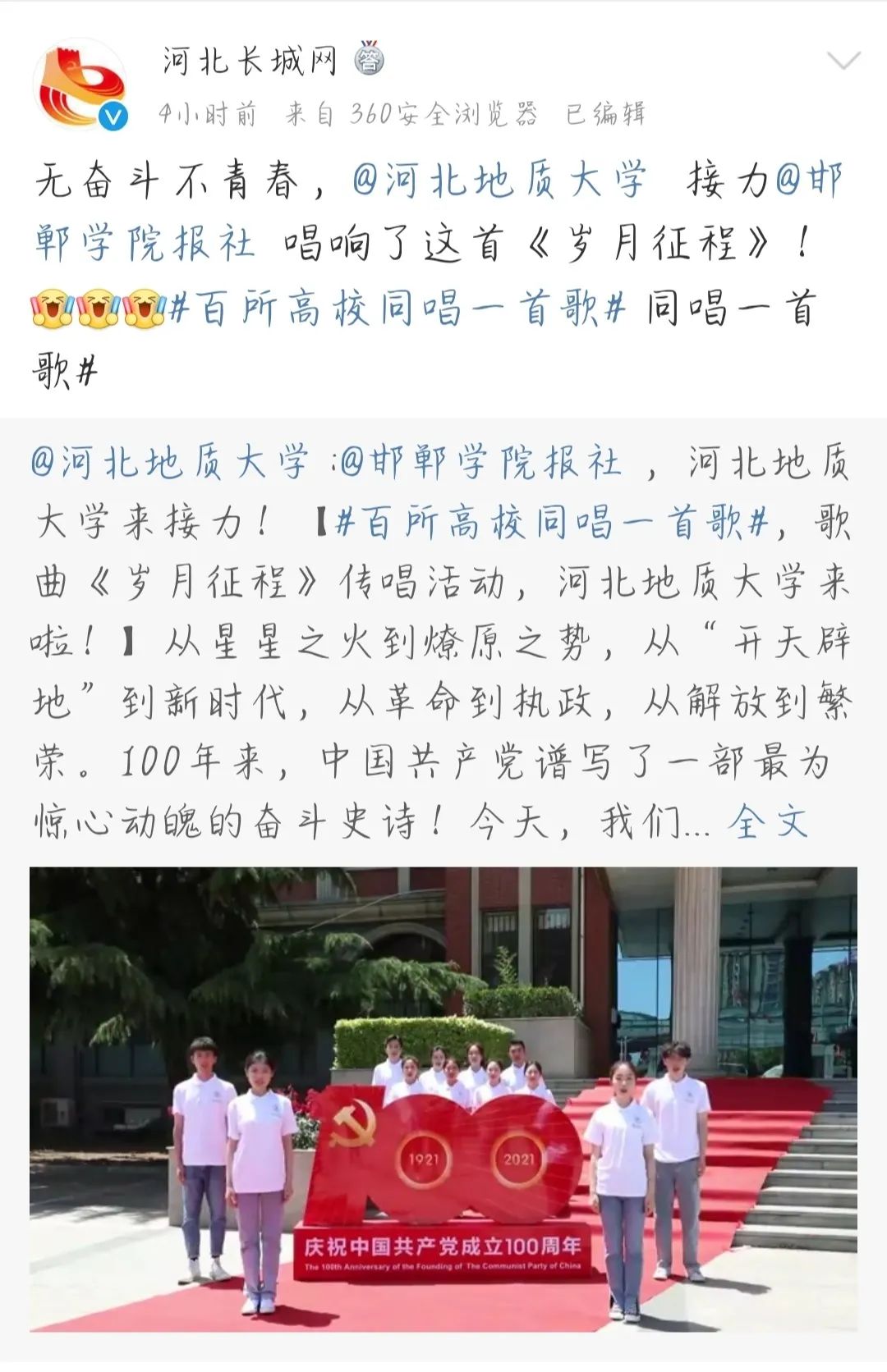 冀时客户端报道 “一百年前你站在这里,长夜里擎起希望的火炬……”,河北广播电视台原创《岁月征程》MV全网发布后迅速形成传播热点。河北地质大学党委宣传部组织师生开展《岁月征程》传唱以及MV摄制,以此展现党的百年光辉历程,引导激励新时代青年学习“四史”、坚定信念信心、勇于担当新使命、接续奋斗新征程,让党史学习教育“主旋律”响彻校园的每个角落。