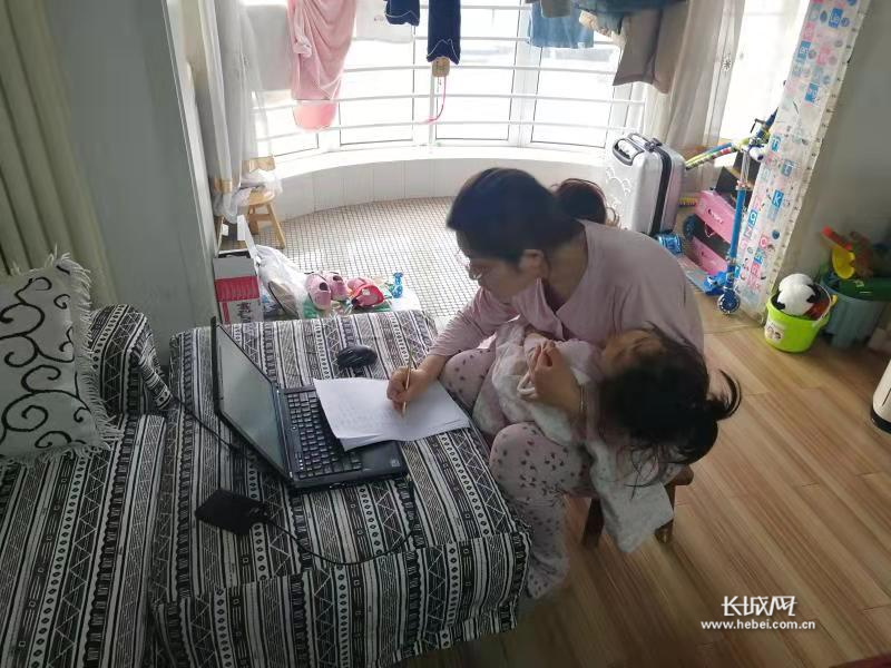 河北地质大学信息工程学院张丽娜老师边照顾孩子边联系学生。