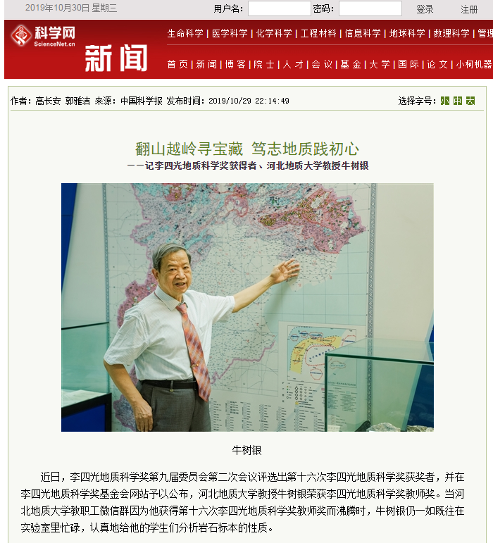 近日,李四光地质科学奖第九届委员会第二次会议评选出第十六次李四光地质科学奖获奖者,并在李四光地质科学奖基金会网站予以公布,河北地质大学教授牛树银荣获李四光地质科学奖教师奖。当河北地质大学教职工微信群因为他获得第十六次李四光地质科学奖教师奖而沸腾时,牛树银仍一如既往在实验室里忙碌,认真地给他的学生们分析岩石标本的性质。