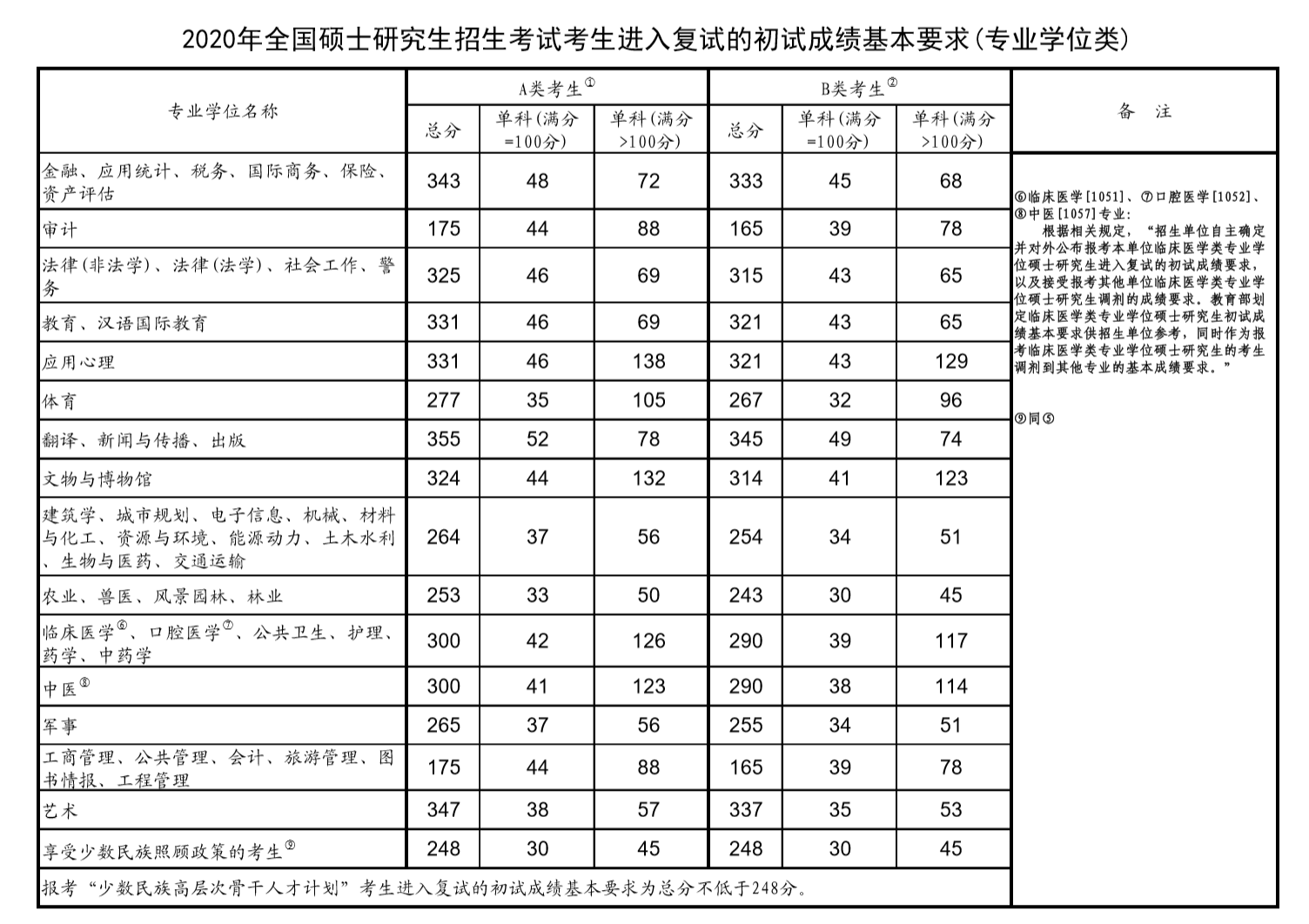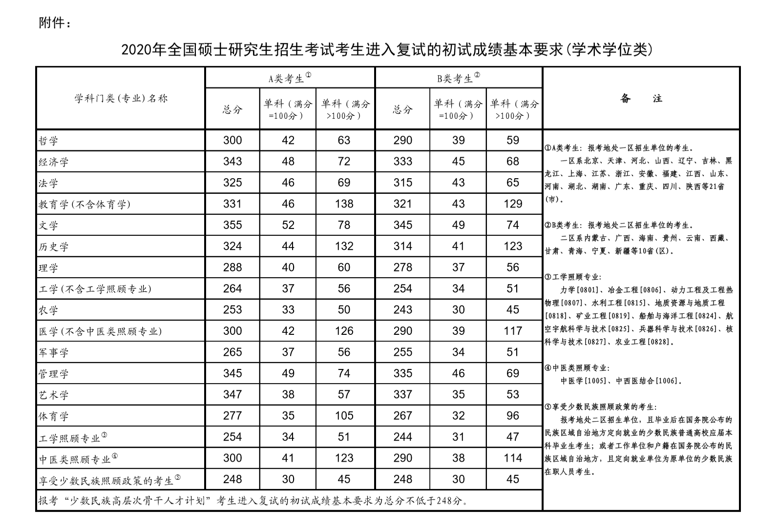 2020年全国硕士研究生招生考试考生进入复试的初试成绩基本要求
