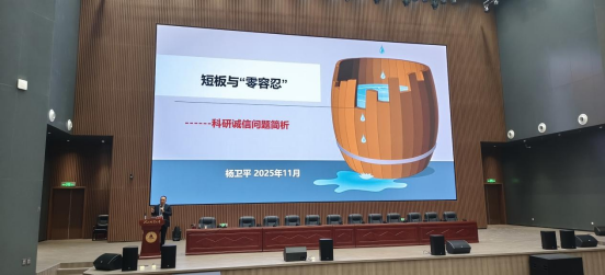杨卫平以“短板与零容忍:科研诚信问题解析”为题,从习近平同志《论科技自立自强》讲起,阐述了对学术不端行为“零容忍”的政策背景,指出“科研诚信是科技创新的基石,科研诚信滑坡是建成社会主义现代化强国的最大短板”,强调了加强科研诚信建设和学风建设的紧迫性和重要性。杨卫平结合大量国内外典型案例,系统剖析了当前科研实践中存在的诚信风险与制度短板,阐释了学术不端的各种典型行为和现象,告诫我们要敬畏学术规范、坚守科研底线、恪守诚信科研原则,并对治理科研诚信和学术不端行为的路径进行了专业解读。