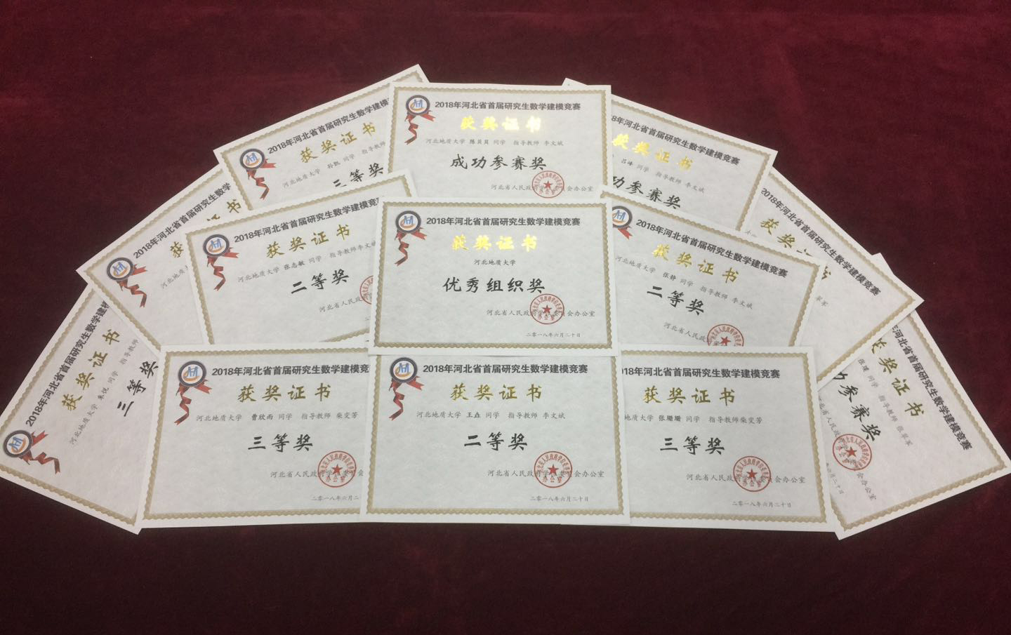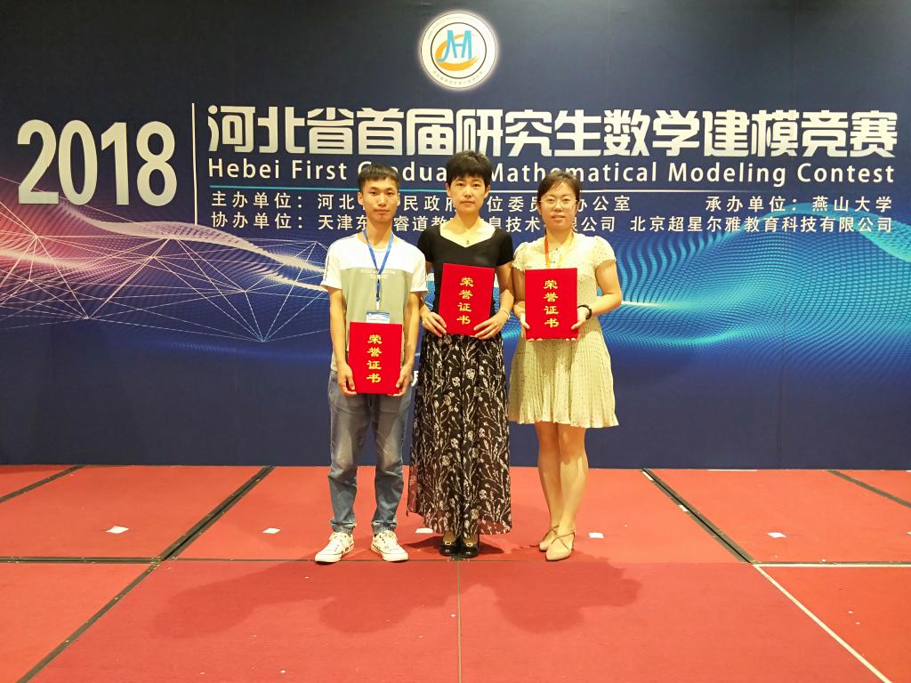 近日,由河北省学位办主办,燕山大学承办的“2018年河北省首届研究生数学建模竞赛”成绩揭晓,我校共有13支队伍参赛,其中由李文斌老师指导的张静、王垚、张志敏团队获得省二等奖;尚国琲老师指导的马庆涛、安红斐、褚铮团队,李焕哲老师指导的李胜杰、李雪晴、丁佳静团队,柴变芳老师指导的曹欣雨、魏春丽、张珊珊团队,赵楠老师指导的孙凯、朱悦、张少杰团队荣获省三等奖;另有4支队伍获得成功参赛奖,我校荣获优秀组织奖。