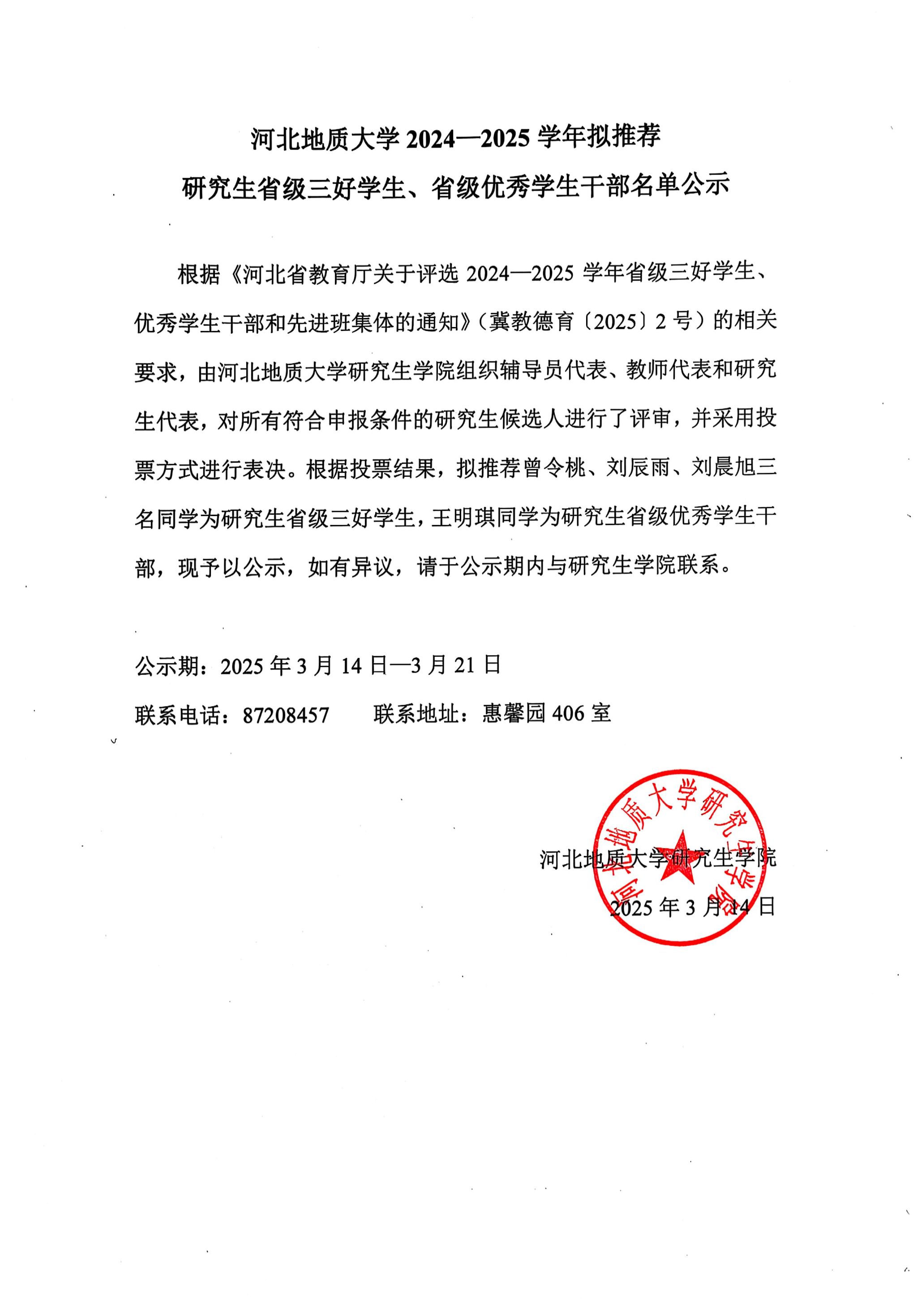 河北地质大学2024/2025学年拟推荐研究生省级三好学生、省级优秀学生干部名单公示