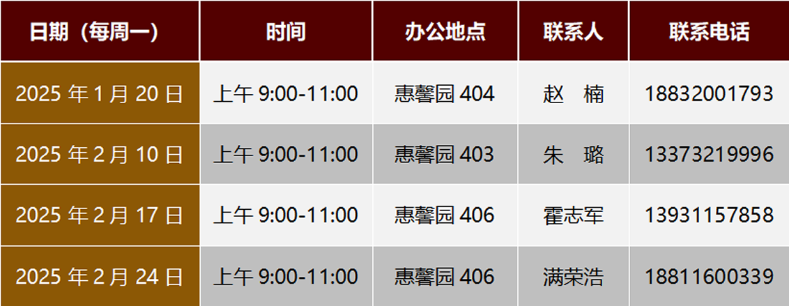 研究生学院2025年寒假期间(2025.1.18—2025.2.28),需线下办理的业务请于以下时间到惠馨园四楼相应办公室集中办理,具体安排如下: