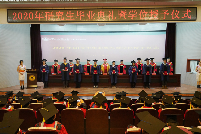 接着,学位授予仪式隆重举行,校党委副书记南振兴宣读了河北地质大学2020年研究生硕士学位授予决定。研究生依次上台,各位校领导为同学们拨苏正冠,颁发学位证书,并合影留念。