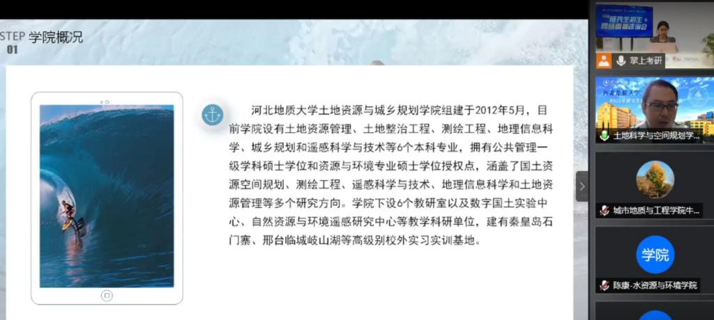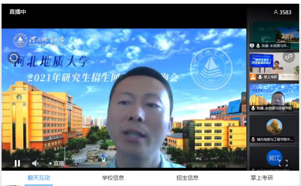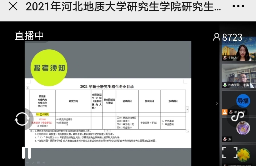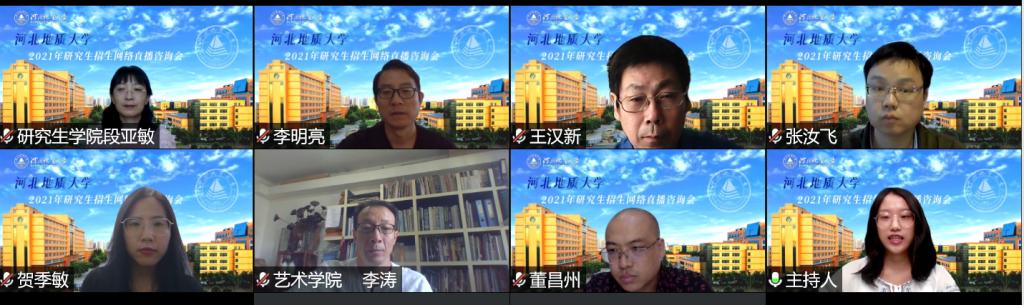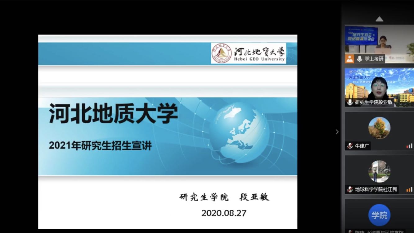 2020年8月27日,研究生学院及11个研究生培养单位齐聚网络直播间,开展了河北地质大学2021年研究生招生网络宣传,此次宣传为期一天,上午、下午两场共12位老师参与了直播。这是我校第一次采取网络直播形式进行研究生招生宣传,这为我校拓展招生宣传模式提供了新思路和新方法。